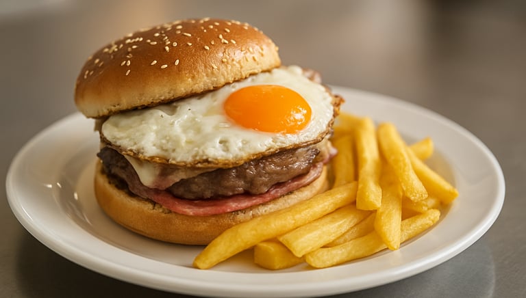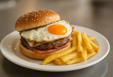 Carne de Ternera, Queso, Lechuga, Tomate, Cebolla, Bacon, Huevo y Patatas Fritas